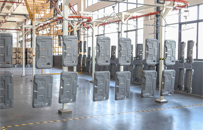 采用高壓靜電粉末噴涂工藝,原材料采用上海寶鋼冷軋鋼板,上海交大高分子材料進(jìn)行噴涂,其中包含7大工藝,13項(xiàng)步驟,整條生產(chǎn)線由一樓預(yù)處理-二樓噴粉烘干-三樓下件進(jìn)組裝線,最大程度地減少人工搬運(yùn)。
