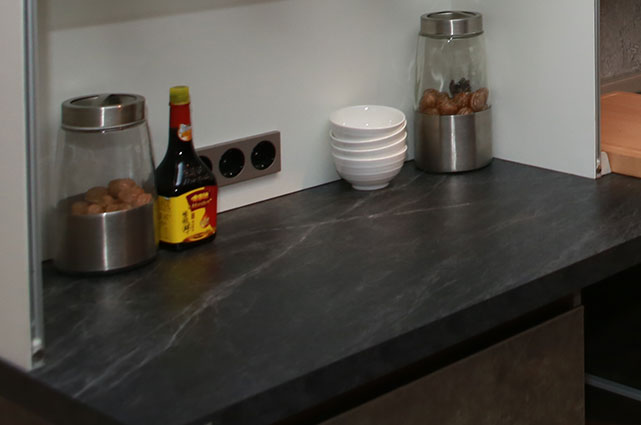 防火板臺面絕燃體、耐沖擊、不開裂,在接縫處安裝的時候使用鋁合金拼條,省去打磨環(huán)節(jié),保證無粉塵,顏色與產(chǎn)品門板顏色渾然一體。