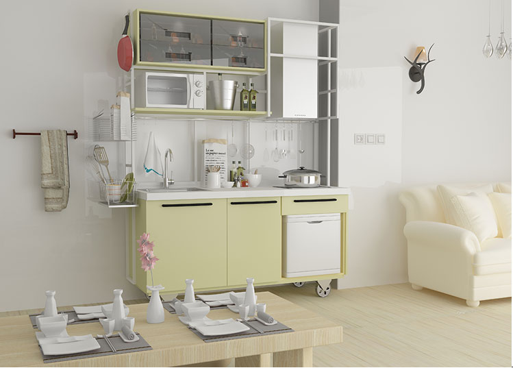 地腳線(xiàn)替換為滾輪,櫥柜背板加上支撐的梁木,爐灶、水槽、廚電三件套齊全,可移動(dòng)的小廚房。