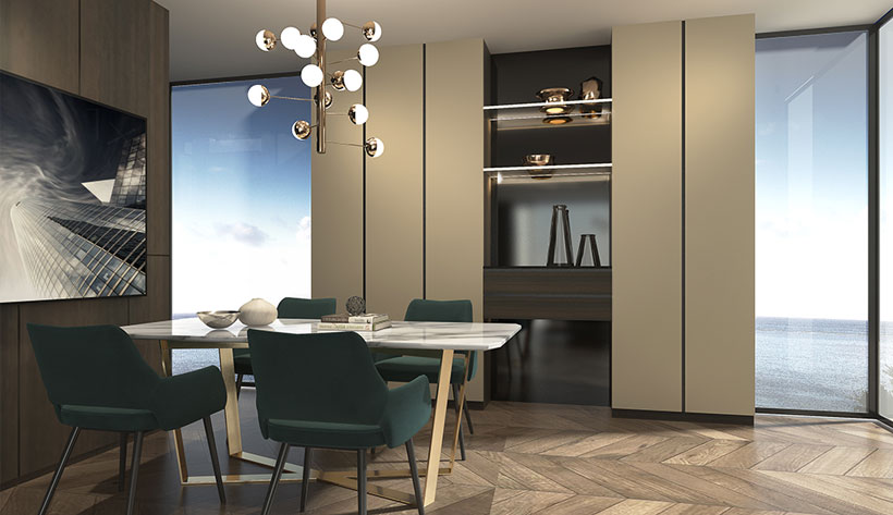島臺圓弧臺面,使得整體線條圓潤細(xì)膩,柔和間顯現(xiàn)著高端的質(zhì)感,方圓間品味生活的藝術(shù)。操作島臺融入就餐功能,提升了空間利用率,美食隨要隨有,溝通交流兩不誤,增進(jìn)和諧的家庭氛圍。